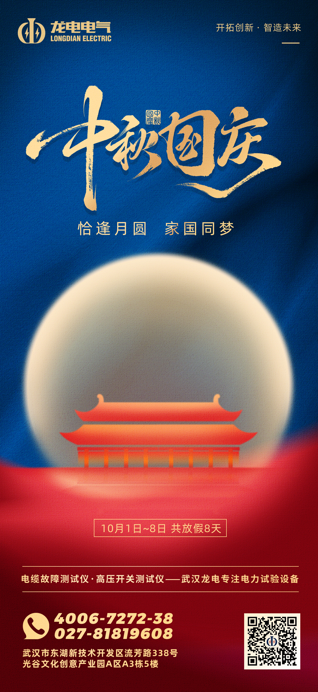 秋色宜人,月圓情濃。值此中華人民共和國成立76周年華誕暨傳統中秋佳節來臨之際,武漢市龍電電氣設備有限公司全體員工向您致以最誠摯的節日問候與祝福!